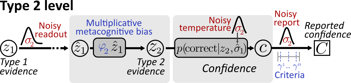 Type 2 criteria account for metacognitive biases that occur at the level of the confidence report, i.e. when observers map an internal sense of confidence to an external confidence scale. The idea of a metacognitive evidene bias is that biases may also occur at an earlier stage - specifically for the internal representation of metacognitive evidence , which is algorithmically reflected as follows (assuming normal type 1 noise):
